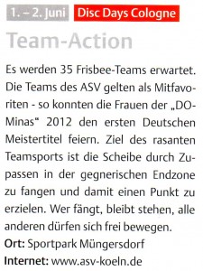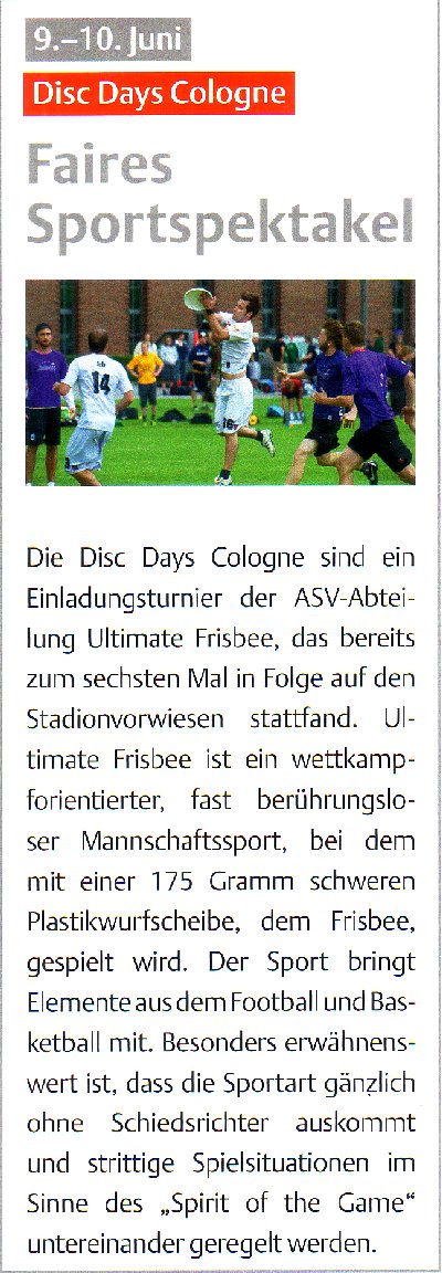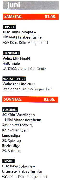 Der neue Sportkalender der Stadt Köln für das Jahr 2013 ist erschienen, darin befindet sich wie bereits im Vorjahr der Hinweis auf die diesjährigen Disc Days Cologne Anfang Juni. Auch im Eventkalender des Stadtsportbundes Köln ist das Event schon vermerkt. Die siebte Auflage des internationalen, hochklassigen Freundschaftsturniers findet am 01. und 02. Juni 2013 auf der Stadionvorwiese und beim ASV Köln statt. Nicht mehr berücksichtigt werden konnte die Ultimate Junioren-EM, die an selber Stelle (vom 05.-10. August 2013), deren Ausrichtung sich erst jüngst kurzfristig ergeben hat.Zusammen mit Köln.Sport hat die Stadt aber nicht nur den Ausblick auf das bevorstehende Sportjahr zusammengetragen, sondern auch einen Rückblick auf 2012. Während der Artikel für die bevorstehenden Disc Days relativ kurz ausgefallen ist (s. rechts), ist der Bericht über das DDC 2012  hingegen etwas ausführlicher und sogar mit einem Bild versehen (s. unten).