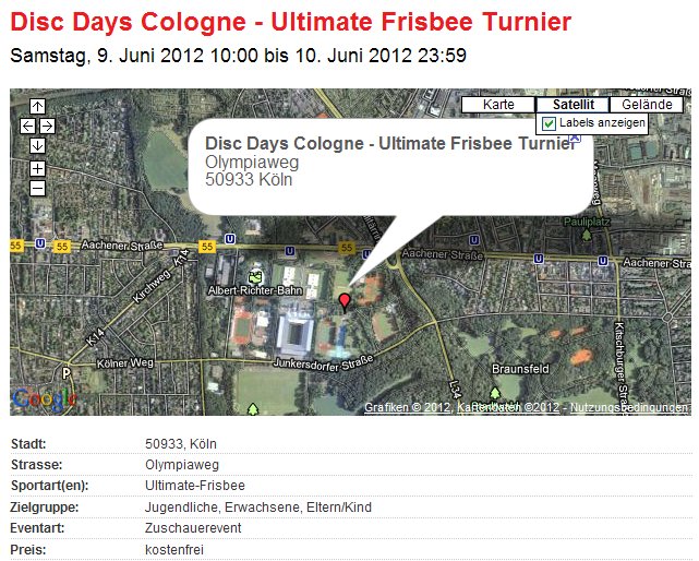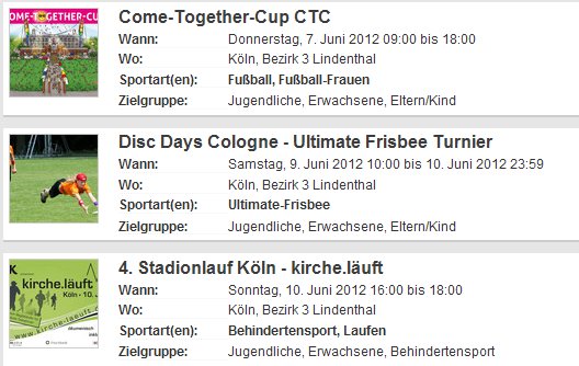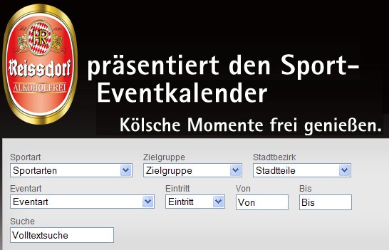 Sportbegeisterte Kölnerinnen und Kölner können sich anhand einer Suchmaske mit Kriterien wie Sportart, Stadtteil, Zielgruppe über die für sie interessanten Veranstaltungen umfassend informieren. Nach Auswahl eines bestimmten Events erscheinen die Details verbunden mit einer Landkarte von Google Maps. Zudem kann ein Widget nach Sportart oder Stadtviertel individualisiert und auf der eigenen Internetseite eingebunden und werden.