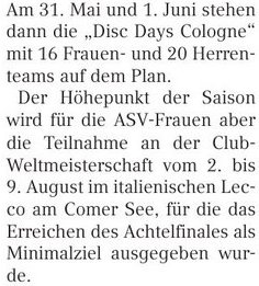 Neben dem ausführlichen sportlichen Bericht zum Teambuilding in Hinblick auf Rio 2016 steht auch ein Interview mit dem ASV-Präsidenten Walter Bungard. Dessen Titel bezieht die Frisbeesport-Abteilung mit ihren sehr erfolgreichen Frauen einfach auch einmal auf sich!