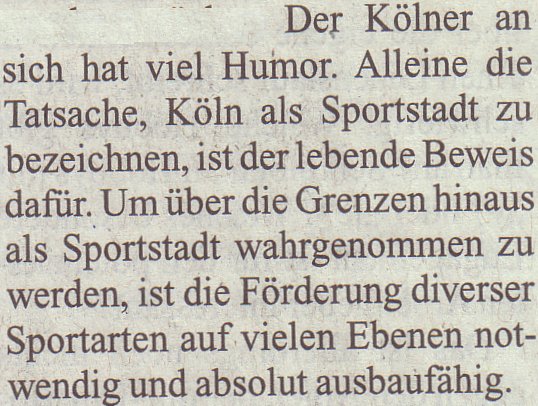 Interessant in diesem Zusammenhang ist sicherlich auch der nebenstehende Aspekt, auf die Frage, ob in Köln die sportliche Vielfalt neben dem Fußball nicht stärker gefördert werden sollte.