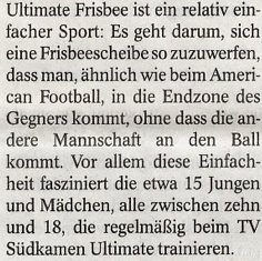 Schön zu sehen und zu lesen, dass in der jüngsten Vergangenheit viel zum ultimativen Teamsport Ultimate Frisbee veröffentlicht wurde. Die 32. Deutschen Meisterschaften in Frankfurt am Main Mitte September brachten drei schöne Berichte (s.u.), die Deutschen Meisterschaften im Junioren-Ultimate wenigstens zwei weitere, zudem ist jetzt ein Beitrag zum Sportaktionstag der Stadt Köln im Bezirk Nippes erschienen. Der Artikel im Kölner Stadt-Anzeiger ist in der Print-Ausgabe größer als eine halbe Seite, mit großem Bild und einer halb frei gestellten Frisbee.