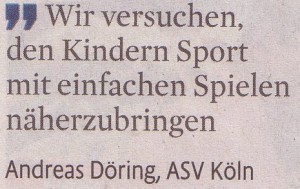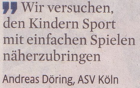 Klasse, dass unser Sport den Titel ziert und im Foto abgebildet wird, wenngleich 340 Fünftklässler insgesamt 19 verschiedene Sportarten ausprobiert haben. Davon waren nur rund zweimal 15 für jeweils zwei Schulstunden bei den beiden Übungsleitern des ASV Köln. Hier kommen wir zum Haken an der Geschichte: Zitiert werden Andreas Döring und meine Wenigkeit, anwesend vor Ort waren jedoch Benno Kerloh und Denis Holzer. Schlecht recherchiert oder einfach etwas zusammengeschrieben? Seis drum, die Aussage und auch die Spielbeschreibung stimmen ja.