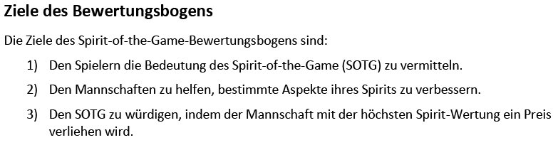 Darin heißt es u.a.: „Wir verstehen, dass der SOTG ein schwer zu fassendes Konzept ist und dass sich Details und Auslegungen zwischen verschiedenen Ländern, Spielniveaus usw. unterscheiden. Halten sich Spieler jedoch an die unten aufgeführten Richtlinien, werden die Ziele des Bewertungssystems erreicht.“ Weiter heißt es darin, dass die Veranstalter zur Duirchfphrung dieser zusätzlichen Auswertung eines Turniers am besten einen Spirit-Beauftragten festlegen, der die Regeln kennt, als integer gilt und nach Sichtung und Auswertung aller Bögen gegebenenfalls mit einzelnen schlecht bewerteten oder schlecht bewertenden Teams spricht. In der Realität ist dieses verfahren dennoch oft mühsam, da pro Spiel nicht nur ein Ergebniszettel, sondern drei nötig einzusammeln sind.