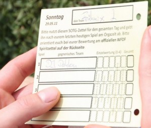 Dieser Spirit-Bewertungsbogen ist sicherlich für Erwachsene sehr geeignet das gegnerische Team zu bewerten, zunächst nach vier Kategorien und abschließend direkt verglichen mit dem eigenen Verhalten. Für Kinder und Jugendliche erscheint mir dieses Verfahren jedoch als zu kompliziert resp. komplex. Meiner Meinung nach müsste hier eine vereinfachte Fassung herhalten (s.u.). Gleichzeitig besteht aber auch die Frage, wie bringen wir die Teams dazu, dieses zusätzliche Ergebnis pro Spiel zuverlässig auszufüllen und abzugeben? Ein Beispiel ist das oben abgebildete Modell (der Ultimate Mixed-DM 2011 2011 in Halle a.d. Saale, s. im Link Frage 7), einen kleinen Bogen pro Tag auszugeben. Der WFDF hat dazu Erläuterungen zum Ausfüllen des Bogens herausgegeben (ins Deutsche übersetzt von Sylvester Przybyla).
