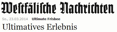 In den vergangenen Wochen sind in der regionalen Presse ein paar schöne News über Ultimate Frisbee erschienen, die ich hier zusammenfasse. Die Westfälischen Nachrichten haben einen kurzen, aber zutreffenden Bericht über die zurückliegende Junioren Ultimate-DM in Münster herausgegeben, kurz betitelt: „Ultimatives Erlebnis„.