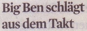 Immerhin wird erstmals seit 60 Jahren Big Ben aus dem Takt geraten (wenn wir einmal fiktive filmische Ausnahmen außer Acht lassen, s.u.). Am Freitagmorgen zwischen 08:12 und 08:15 Uhr wird Big Ben zur Eröffnung der Olympischen Sommerspiele 2012 in London 42 mal schlagen. Zuletzt schlugen die berühmtesten Glocken der Welt 1952 aus der Reihe, zur letzten Ehre des verstorbenen Königs George VI.
