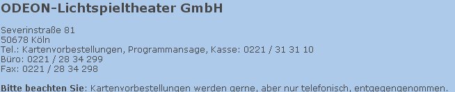 Die Vorführung in Köln findet am Mittwoch abend um 21:00 Uhr im Saal 2 des Odeon mit 90 Plätzen in der Severinstraße statt. Das genaue Rahmenprogramm steht noch nicht fest. Doch der Film selbst ist sicherlich ein Erlebnis für alle, die nur im