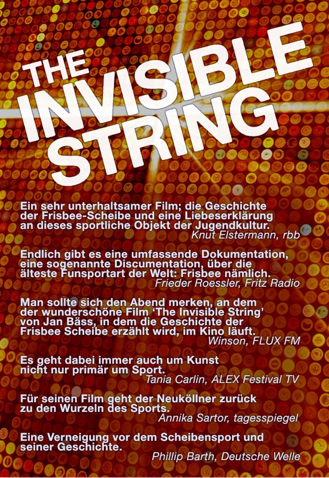 Mehrere Presseberichte haben bereits den Film behandelt, so in der Heilbronner Stimme oder in der Leipziger Internet-Zeitung. Hier der Link zu meinem Vorbericht zur Premiere. Im Bericht der österreichischen Discgolf-Seite heißt es: „Beginnend bei der Geburtsstunde der “fliegenden Untertasse” über die Entstehung der diversen Disziplinen spannt Bäss den Bogen auch über die so wichtige Philosophie, den Spirit, die Leidenschaft und die Passion, die die Aura der Frisbee-Bewegung ausmachen.“ Ein „Poesiealbum für Frisbeespieler“ nennt der Regisseur sein Werk, das offiziell wie folgt beworben wird: „The Invisible String“ ist eine leidenschaftliche Liebeserklärung an einen Lebensstil – der für manche eine Kunstform, für die meisten Sport ist – und für alle Spaß am Spiel bedeutet: Frisbee!
