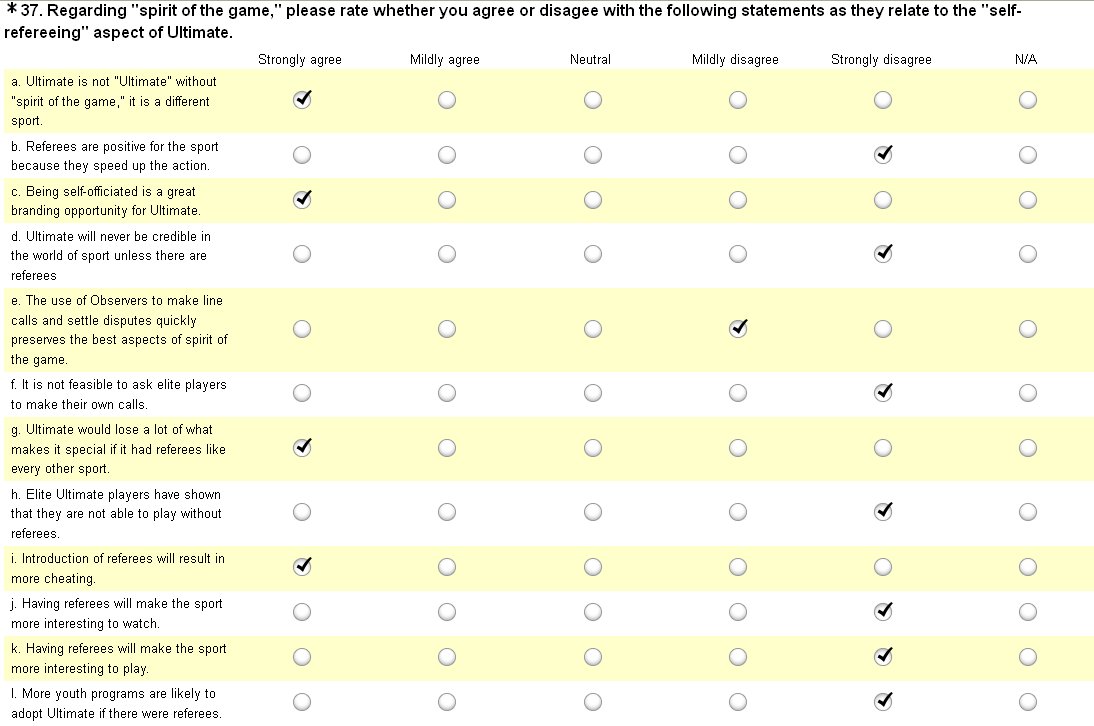Ich gebe sehr gerne hier meine Antworten auf die Frage nach dem „Spirit of the Game“ öffentlich bekannt und kommentiere sie etwas ausführlicher. Zu a: Natürlich ist Ultimate ohne den Regelparagrafen 1 „Spirit of the Game“ nicht mehr Ultimate, da ich den Begriff „Spirit“ hier formaljuristisch als „Sinn des Spiels“ übersetze (gemäß der Redewendung „Sinn und Zweck des Gesetzes“, als „spirit and purpose of the law„). Zu b: Dass externe Schiedsrichter damit der Grundidee dieses festgelegten Sinns des eigenverantwortlichen Spiels entgegen stehen, versteht sich von selbst.