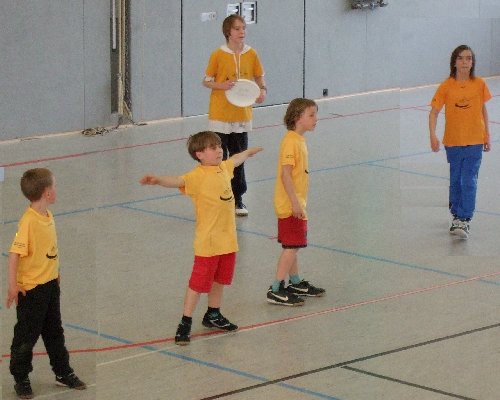 Erster Eindruck: Ein großartiges Spielniveau schon in der jüngsten Altersklasse, der U14. Mehr als ein Dutzend Teams hatten sich hier angemeldet, damit sogar etwas mehr als in der U17. Rekordbeteiligung jedoch bei der U20 mit 16 teilnehmenden Teams (s. unter Anmeldeverfahren). Die jüngsten Mitspieler stellte das Leipziger Team von „Pizza Volante“, abgesehen von Vincent, Sohn des Coaches Chris Dehnhardt (im Bild mit Scheibe) und Kiran (rechts) im Kern weitgehend ein U10-Team!