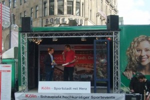 Zahlreiche junge und ältere Leute wurden aufgefordert, nicht nur beim Turnier, sondern auch beim Training vorbeizuschauen. Zwei Sportlehrer äußerten ihr Interesse daran, den Sport schon in der Grundschule einzuführen. Ein Auftritt auf der Bühne des Sportamtes machte die Präsenz der Frisbeesportler beim „Sport Shopping Sonntag“ komplett. Dabei konnte ich im Gespräch mit dem Radio Köln-Moderator Konstantin Klostermann auf das Turnier hinweisen, Hintergründe des Leistungssports und die verschiedenen Sportarten erläutern. Radio Köln hatte am Morgen bereits auf die Veranstaltung hingewiesen und dabei besonders das Frisbee-Zielwerfen hervorgehoben. Erwähnt wurde es auch im Nachbericht der Kölnischen Rundschau.
