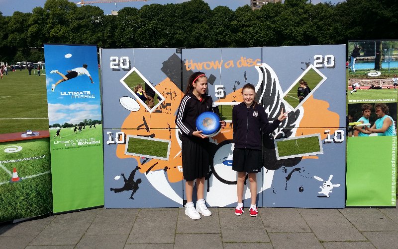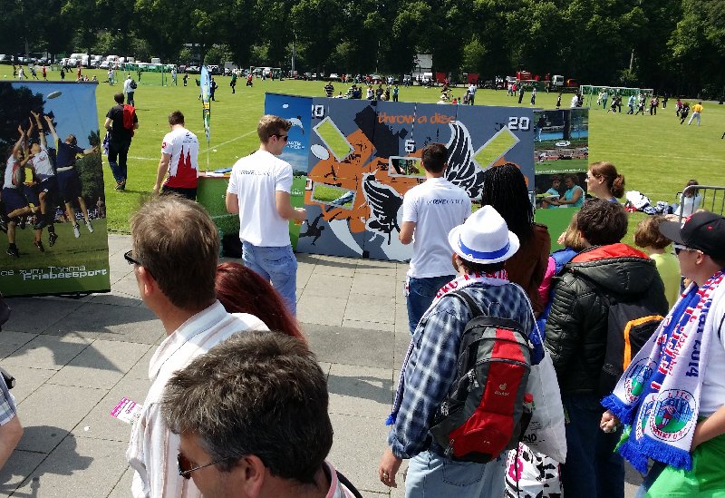 Wurfwand-Frauenpokalfinale14aSchon traditionell war die Frisbeesport-Abteilung des ASV Köln beim großen Familien- und Fanfest des Sportamtes Köln vor dem DFB-Pokalfinale der Frauen beteiligt. Während auf zahlreichen Kleinfeldern auf den Stadionvorwiesen zehn Mädchenturniere stattfanden, hatten die Ultimate Frisbee-Spieler ein Endzonen-Spielfeld vor der Hauptbühne zur Verfügung. Daneben stand die Wurfwand an neuer Position im Mittelgang zwischen beiden Wiesen wie üblich unter Dauerbeschuss!