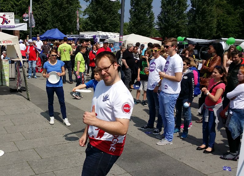 Auch die Frisbeesport-Abteilung des ASV Köln kam um kurz vor zwölf an die Reihe. Ich konnte bei Moderator Konstantin Klostermann von Radio Köln auf die bevorstehenden Saison-Höhepunkte hinweisen: Zunächst an selber Stelle, wo das Familien- und Fanfest stattfand, am 31. Mai und 1. Juni die 8. Disc Days Cologne mit 16 Frauen- und 20 Openteams, dann die Beteiligung von Kölner Mädchen und Jungen an der  U17 Ultimate-EM Mitte Juli am Comer See und schließlich die Teilnahme der Kölner Frauen von „U de Cologne“ an der Ultimate-Clubweltmeisterschaft Anfang August, wiederum in Lecco in Italien.