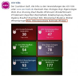 Bereits zuvor stehen weitere termine auf der Tagesordnung: So wird die Outdoor Sasion 2013 am Samstag in einer Woche (23.03.) mit dem ersten Trainingstag der ersten und zweiten Open-Teams beim ASV Köln eigeläutet. Und schon bald nach der Saisoneröffnung, am Wochenende 06. und 07. April findet ebendort ein Trainingslager des U23 Mixed-Nationalteams in Vorbereitung auf die diesjährige U23 Ultimate-WM in Toronto statt, inklusive eines Trainingsspiels des ASV-Mixed-Teams gegen das U23-Nationalteam. Im U23 Mixed-Nationalkader sind übrigens auch mehrere Kölner Athletinnen und Athleten. Nicht zu vergessen natürlich die diesjährigen 7. Disc Days Cologne, die der Verein ASV gerade erst (neben anderen Terminen) über Facebook gepostet hat (s. rechts).